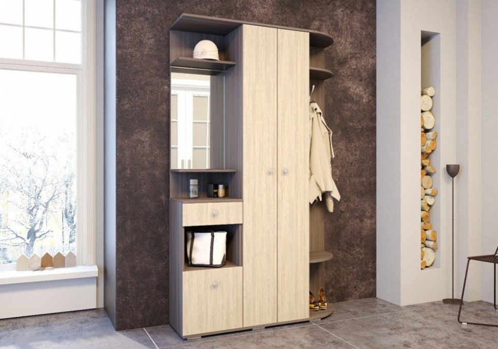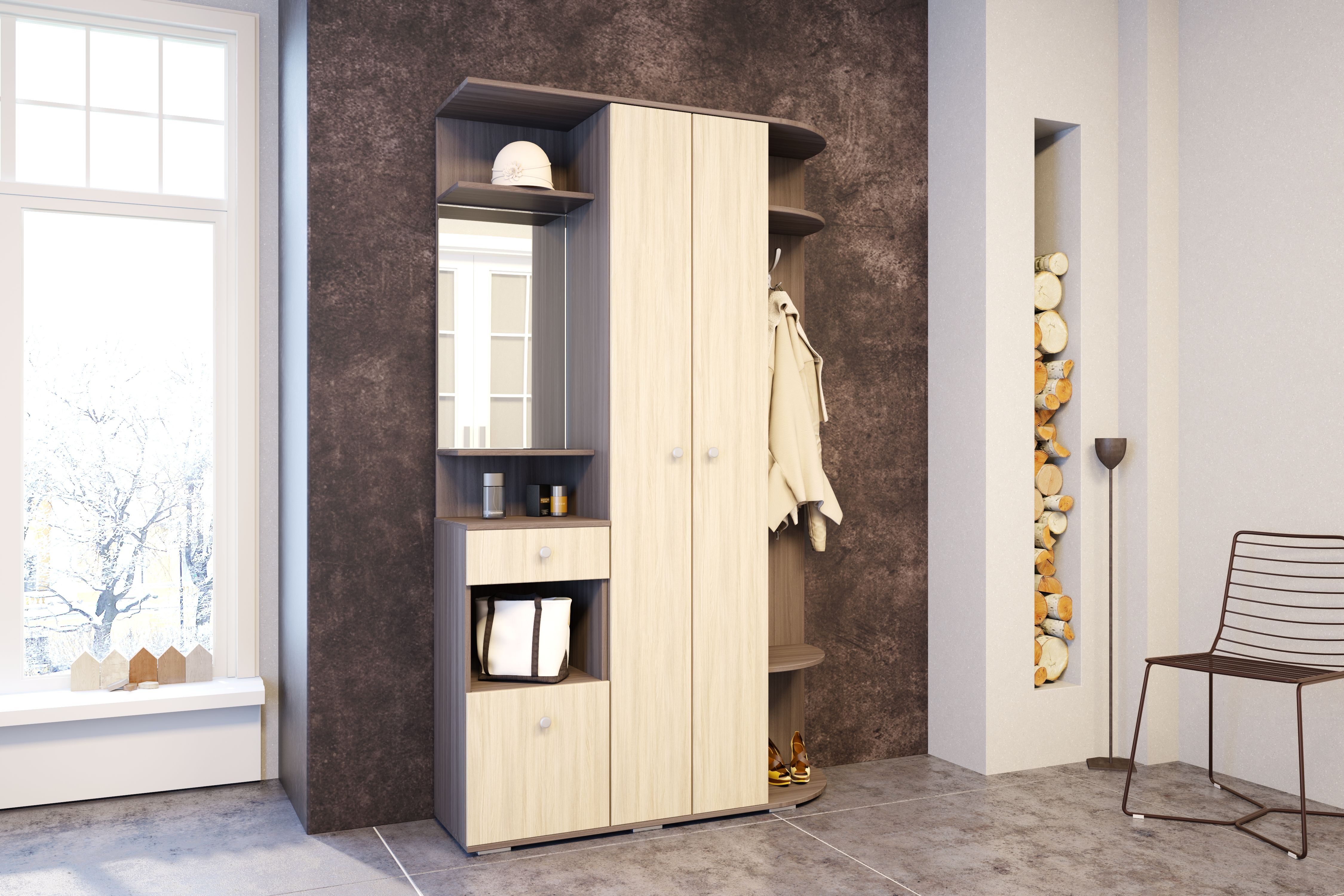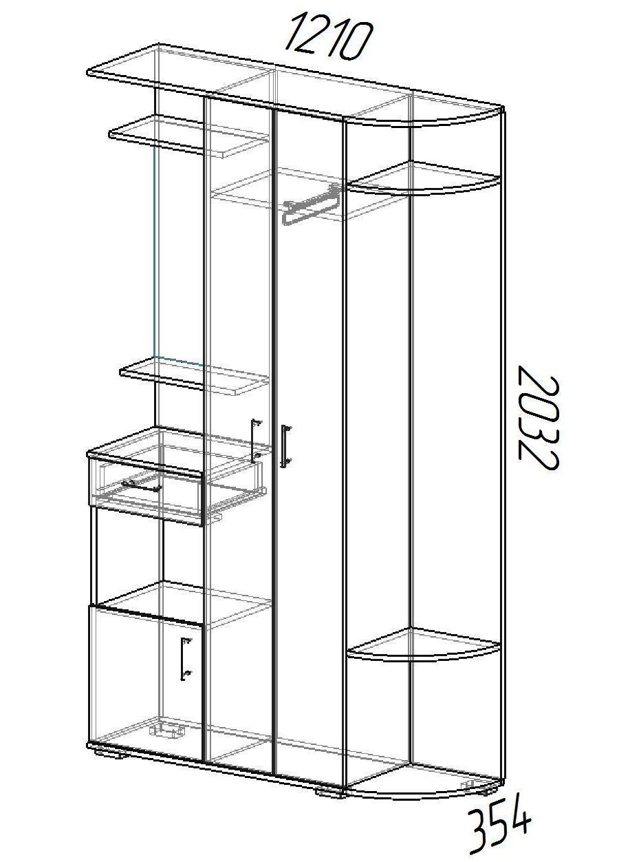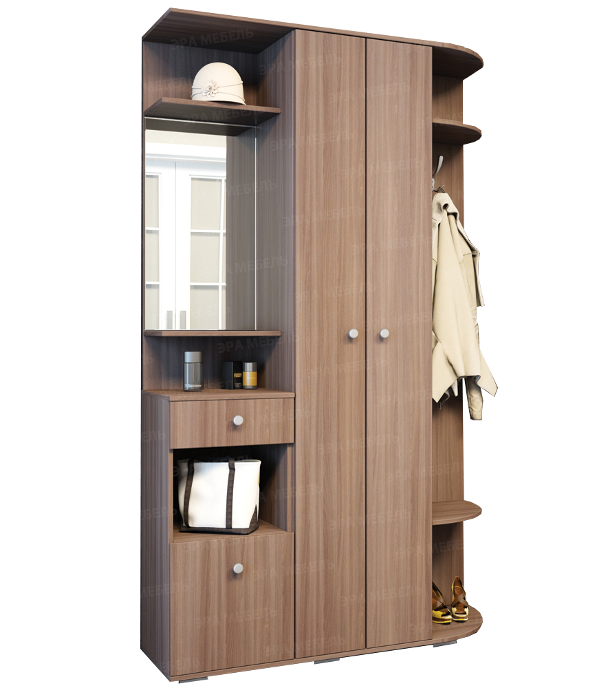 Открытая часть включает отделение для верхней одежды с крепкими металлическими крючками. Внизу расположены две полки для обуви, вверху - отделение для шляп и зонтов. Кроме того, в конструкции предусмотрена небольшая тумбочка с ящиком и шкаф со штангой и полкой для головных уборов.
