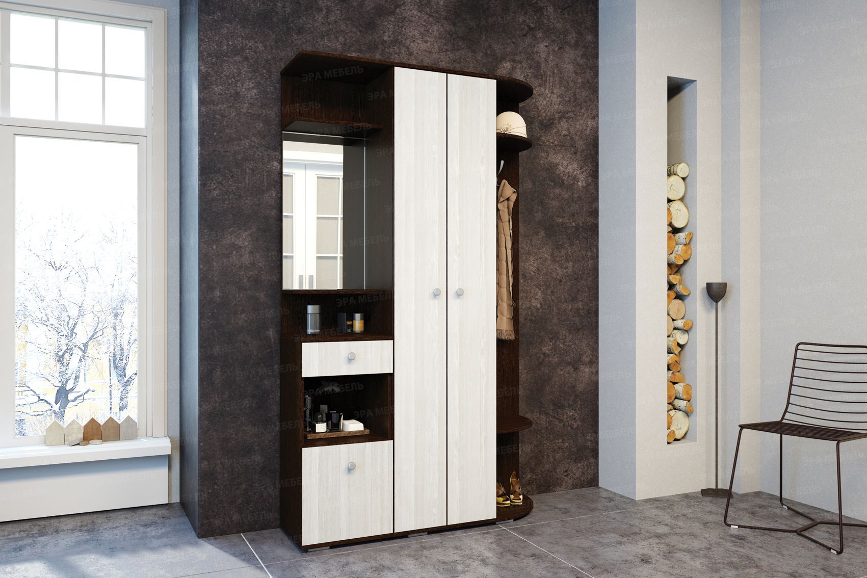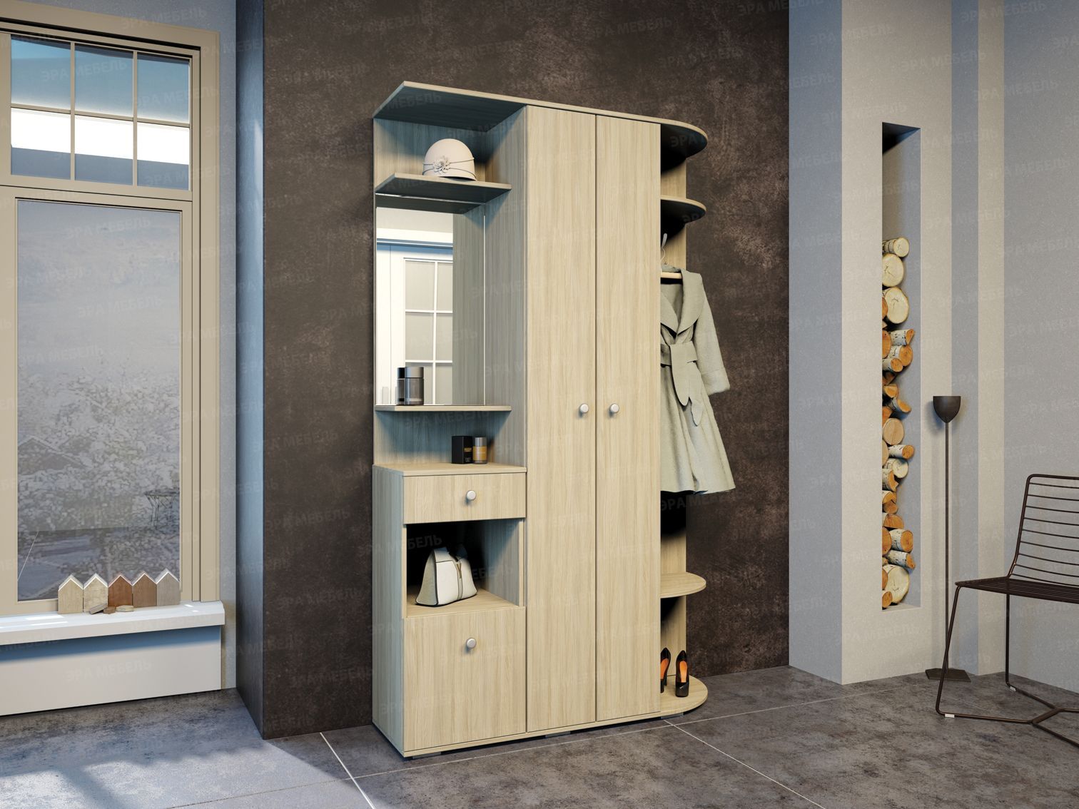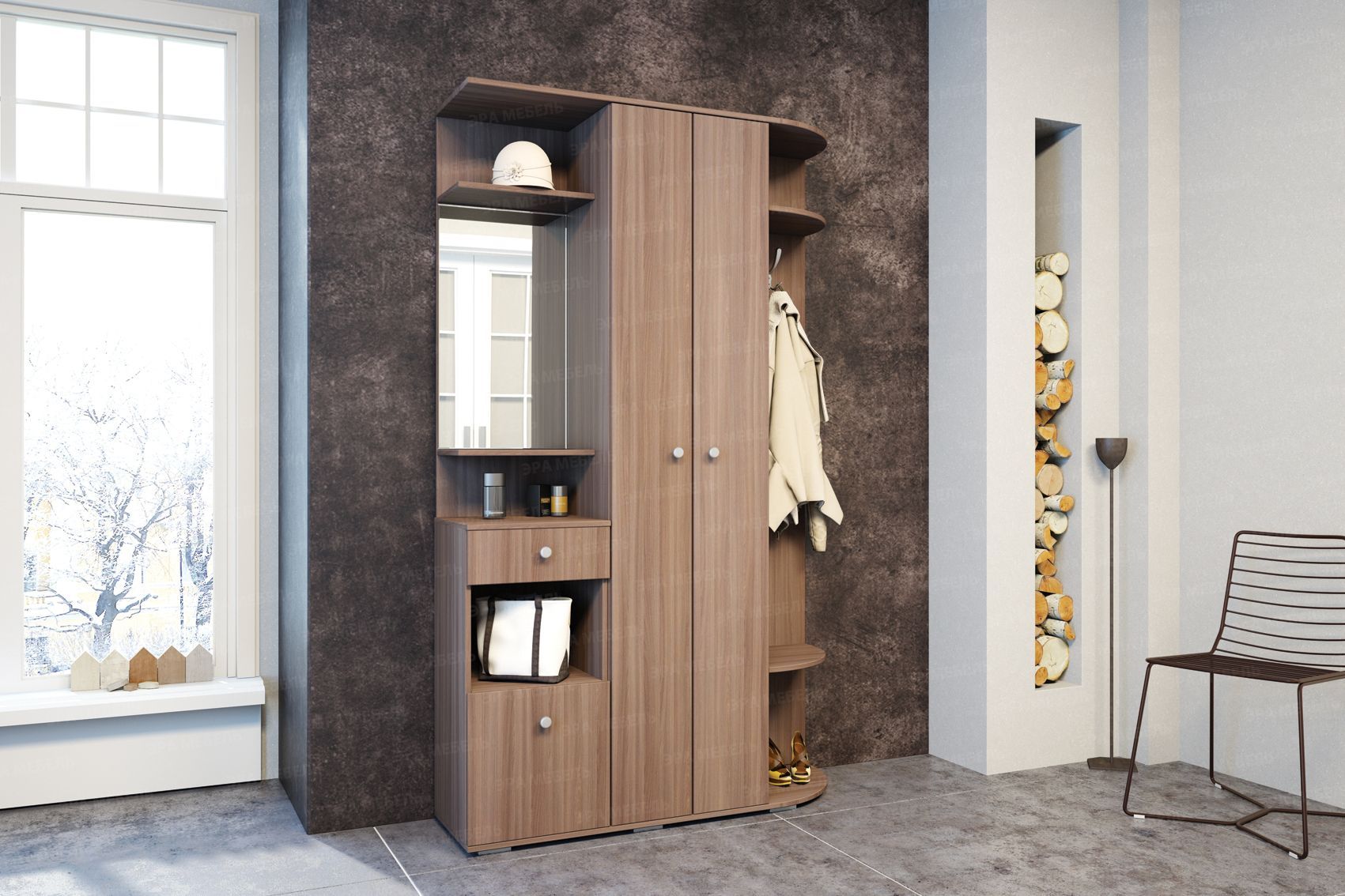Открытая часть включает отделение для верхней одежды с крепкими металлическими крючками. Внизу расположены две полки для обуви, вверху - отделение для шляп и зонтов. Кроме того, в конструкции предусмотрена небольшая тумбочка с ящиком и шкаф со штангой и полкой для головных уборов.