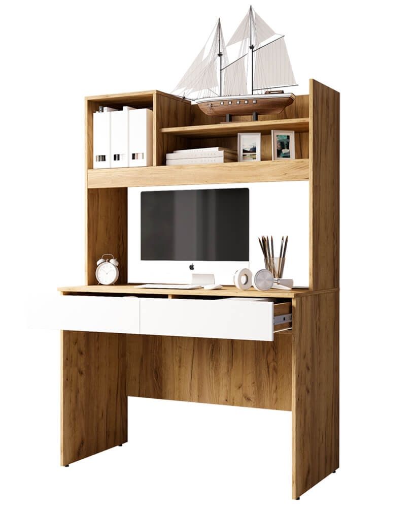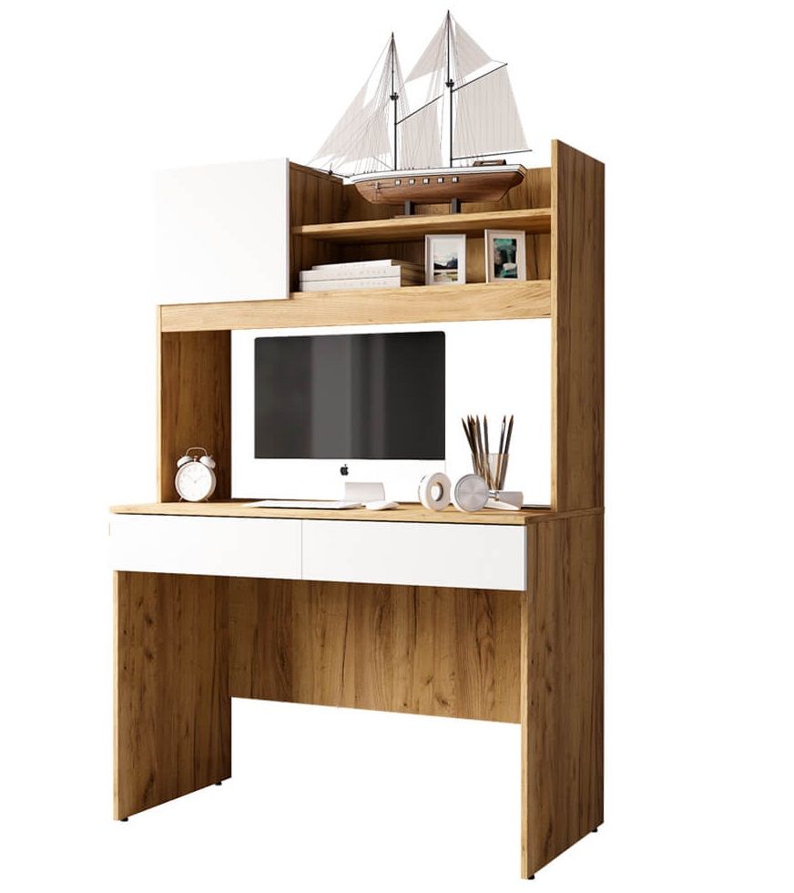 Модель выполнена в цвете крафт в гармоничном сочетании с белым глянцем, в выдвижных ящиках и нишах над столешницей получится разместить все необходимые для работы или учебы вещи.