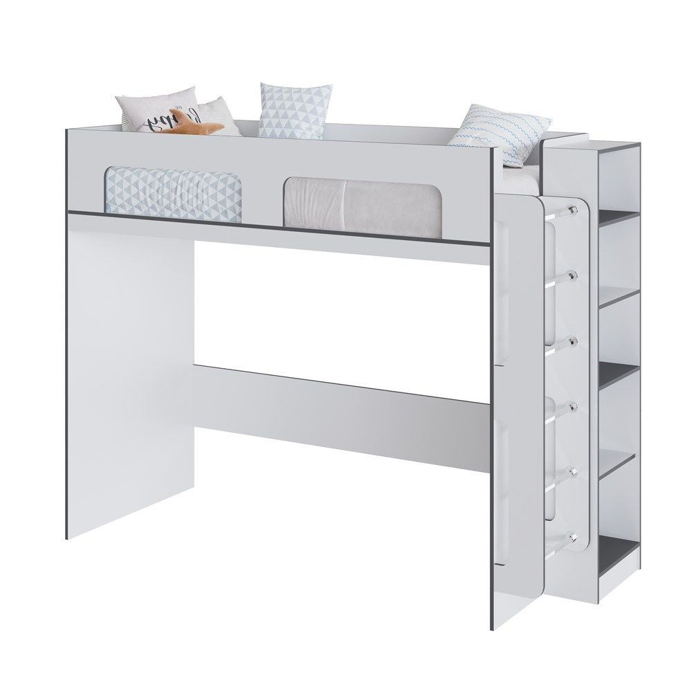 Кровать чердак спроектирована под одно спальное место и может дополняться вторым спальным местом (кровать с ящиками) или рабочим местом (шкаф малый, письменный стол) .Полку навесную можно повесить как горизонтально так и вертикально. Тумбу открытую можно доукомплектовать мягким сиденьем из ткани велюр цвета Серый. Все модули из коллекции имеют кромку серого цвета. Из ЛДСП Графит Серый выполняются отдельные элементы: