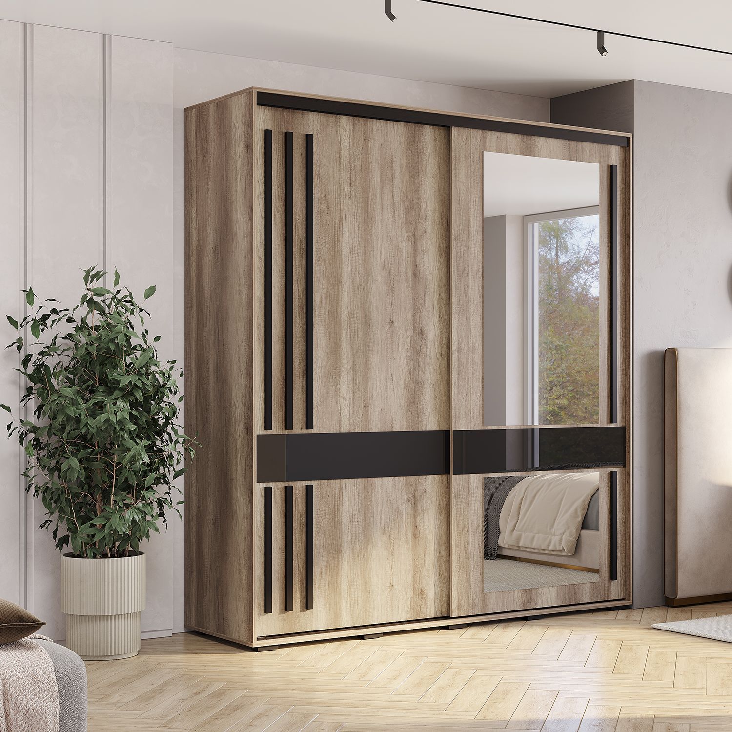 Шкаф-купе "Крафт-8" выполнен в натуральном теплом декоре, повторяющем текстуру дерева. Двери шкафа украшены удлиненными черными ручками из МДФ-профиля, которые гармонично сочетаются с основным цветом и обеспечивают комфортное открытие. Шкаф комплектуется большим зеркалом, которое увеличивает пространство и создает стильный акцент, а черный лакобель придает современный и элегантный вид.