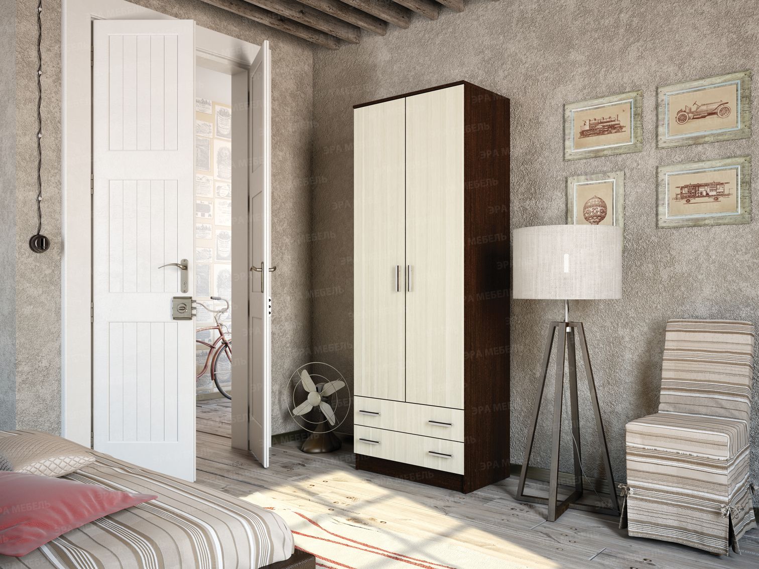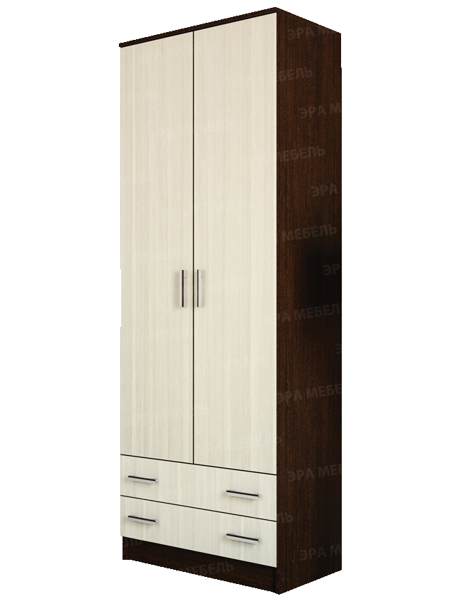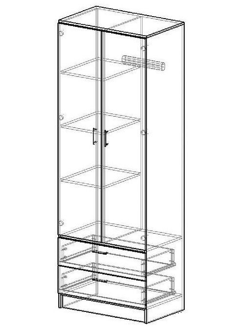 Внутри вместительного и, вместе с тем, малогабаритного шкафа предусмотрено все необходимое для хранения вещей: отделение с полками, ниша со штангой, глубокие выдвижные ящики.