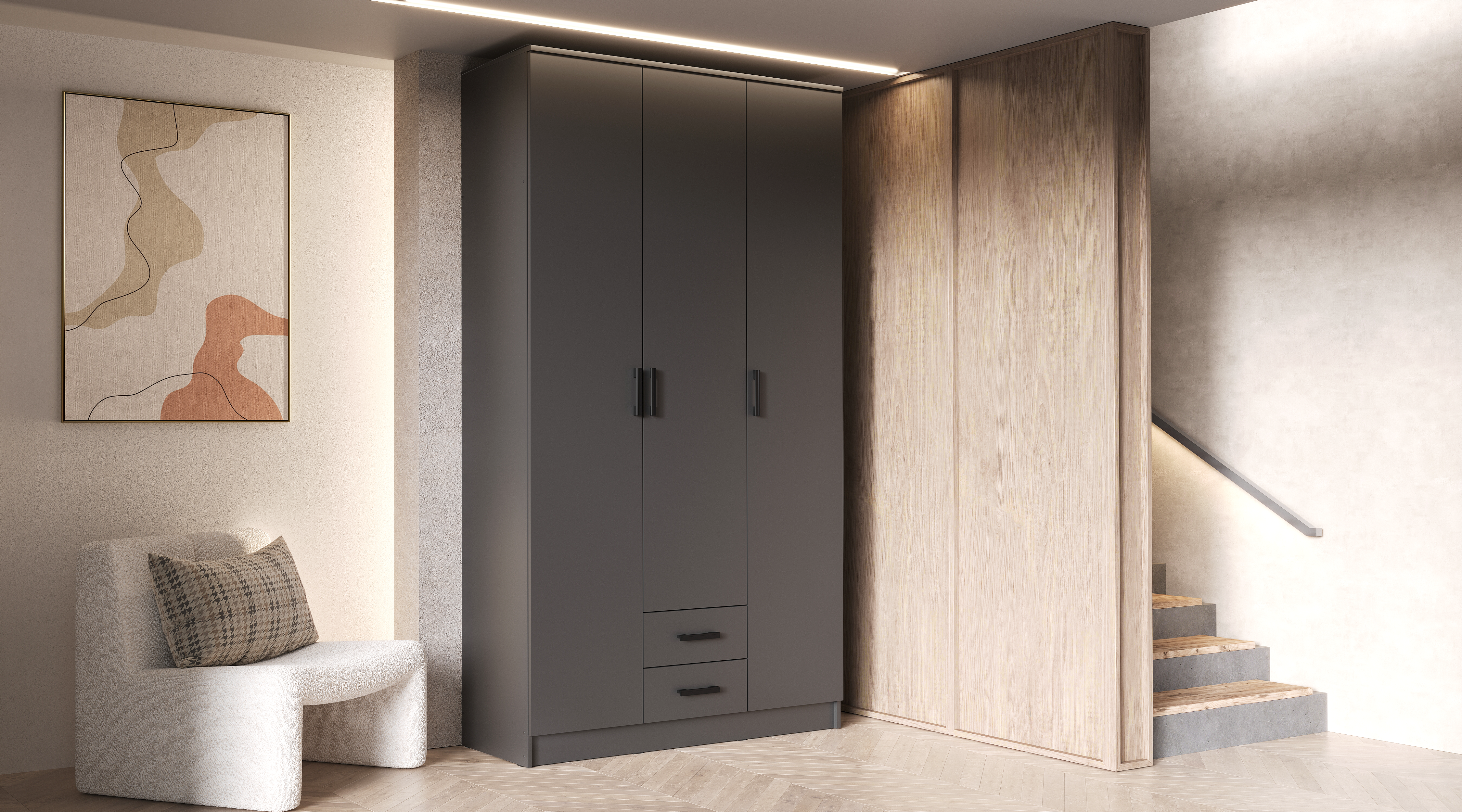 Шкаф "Трио" станет элегантной деталью интерьера спальни, может использоваться в качестве гардероба для верхней одежды в прихожей. Компактная модель занимает минимум места, но имеет хорошую вместимость.