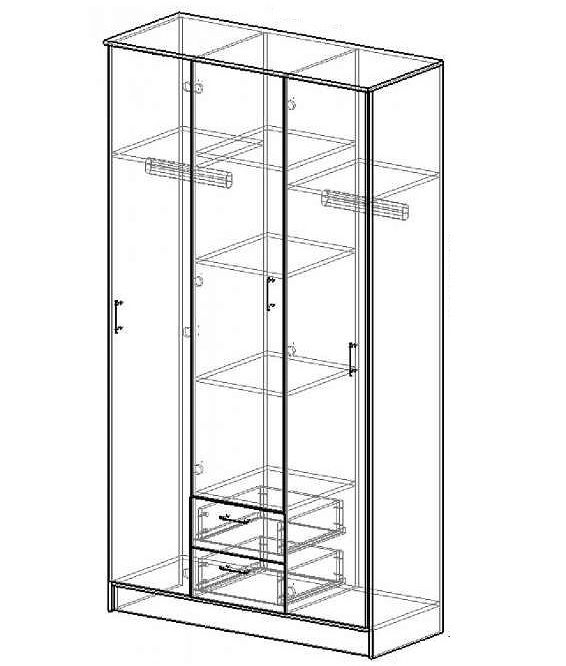 Внутреннее пространство шкафа разделено на три части: два боковых отделения оборудованы металлической штангой для плечиков, в центре расположены три вместительные полки, на которой можно хранить вещи и иные принадлежности, и два ящика.