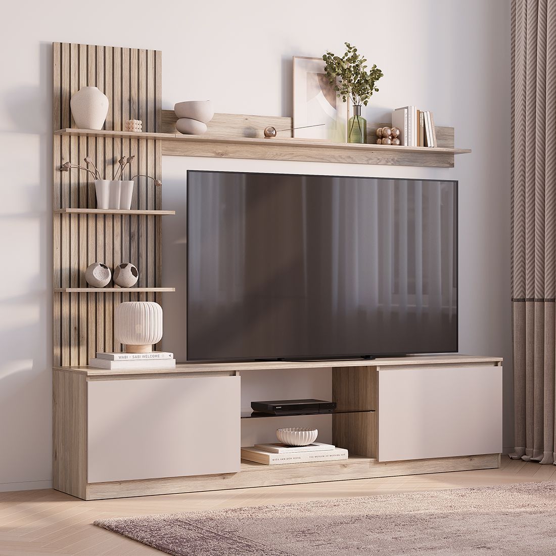 Гостиная "Рио" представляет собой единую конструкцию и вмещает в себя всё необходимое для компактного хранения - вместительная ниша под ТВ, открытые полки для домашней акустики и нужных вещей.