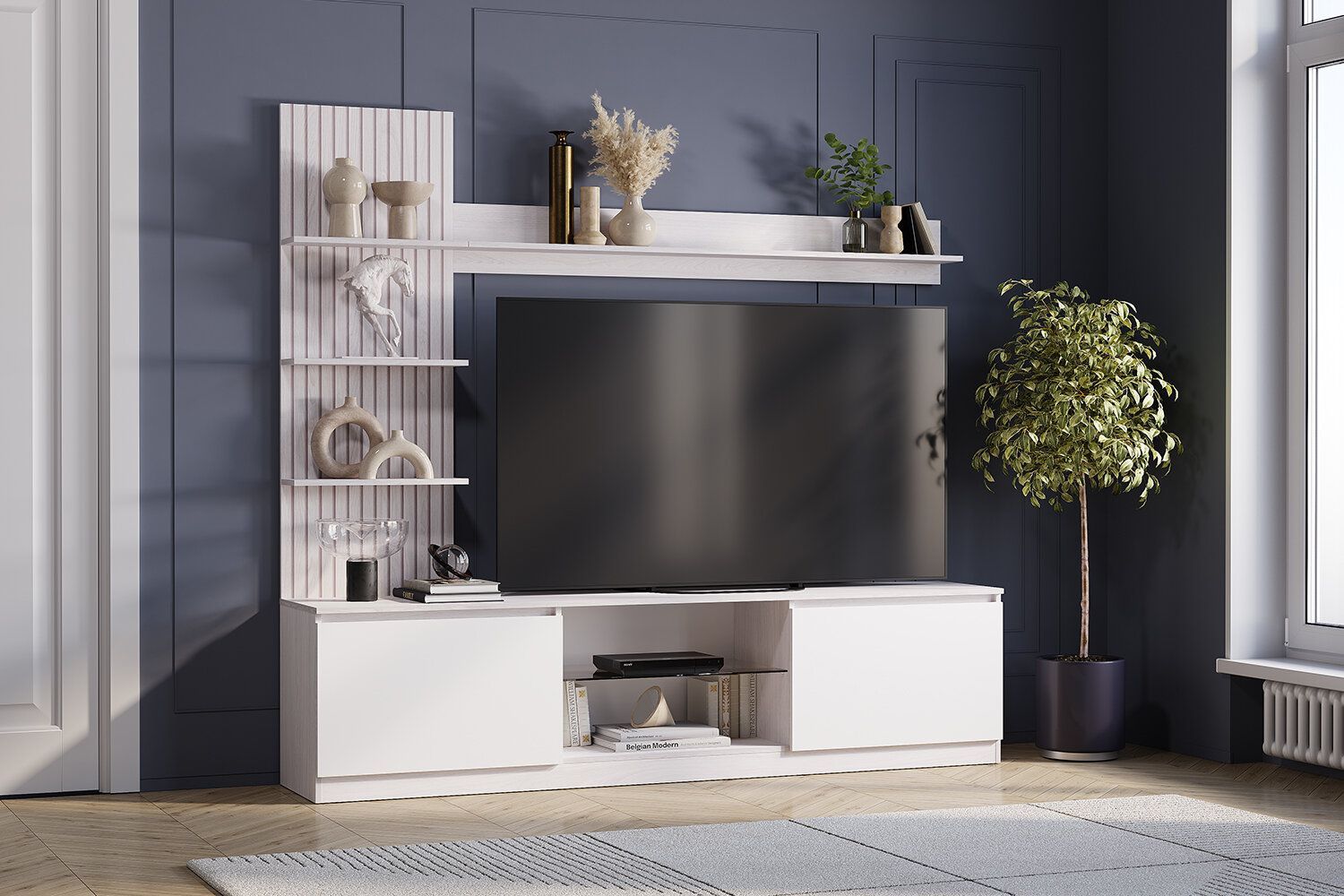 Гостиная Убер - это минималистичная модель с максимально простыми линиями в светлых оттенках. Благодаря матовому покрытию фасадов и отсутствию лицевой фурнитуры ухаживать за мебелью очень легко. Особенностью модели является имитация деревянных реек.