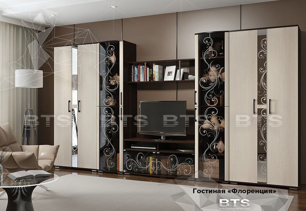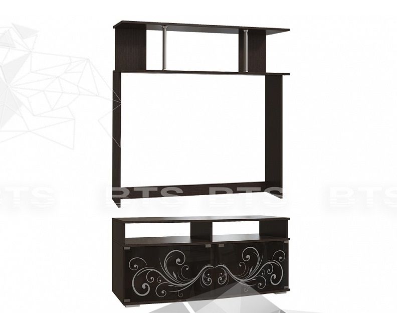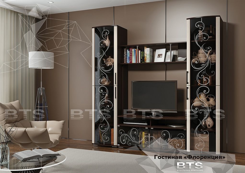 Ниша под ТВ размером рассчитана на большой телевизор с диагональю 50 дюймов, на нижние полки вы можете разместить аудио и видео аппаратуру. Центральная секция может комплектоваться как стеклопеналом, так и шкафом, или можно совместить и то, и другое, в зависимости от ваших приоритетов.