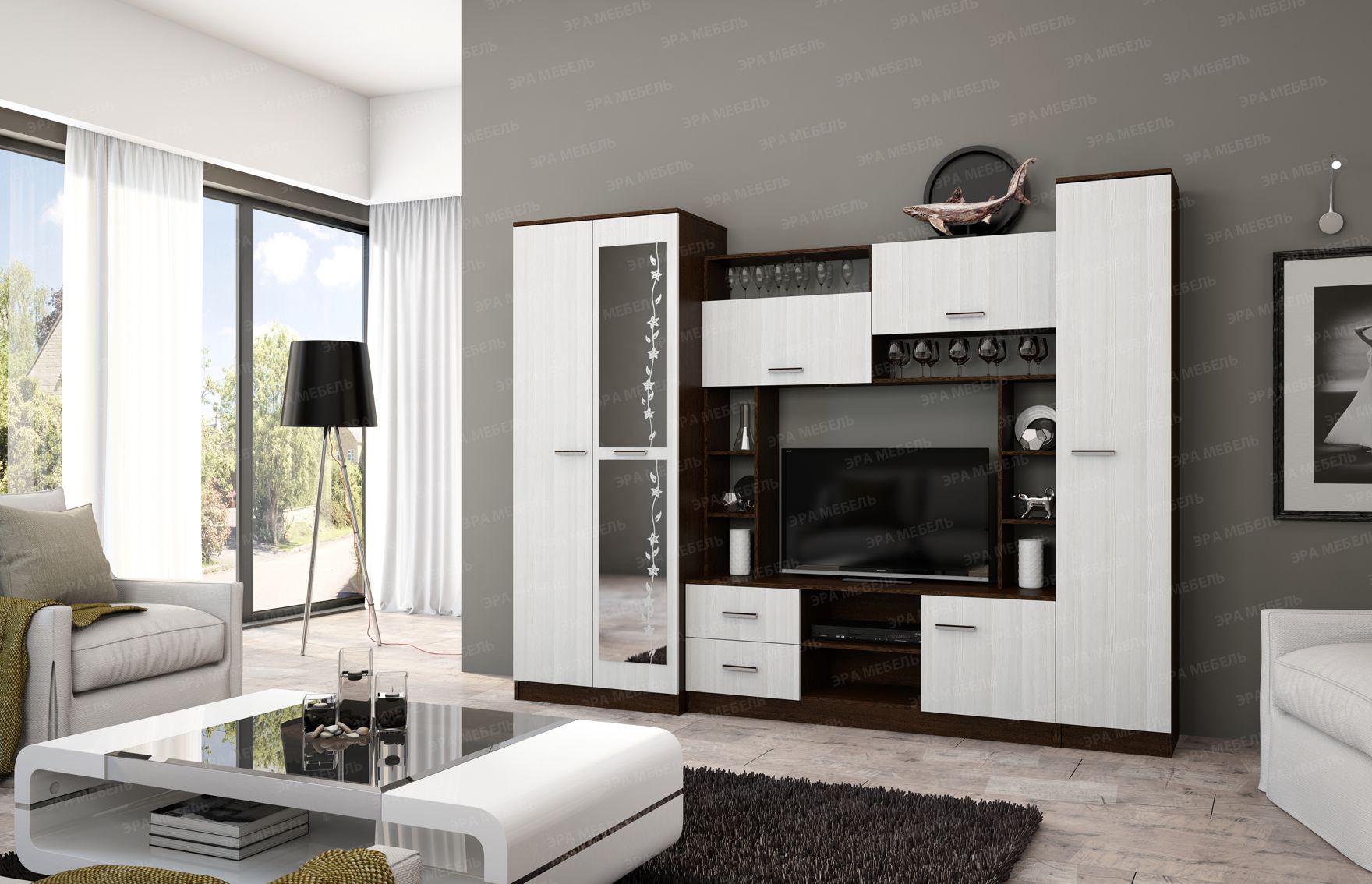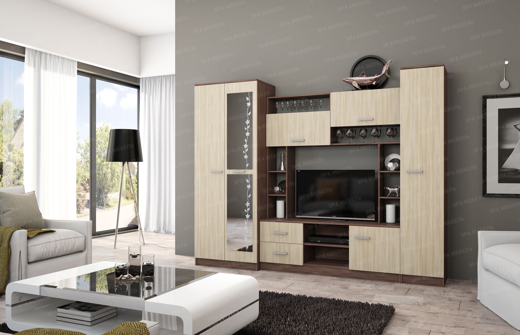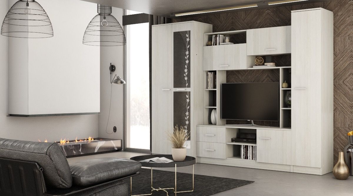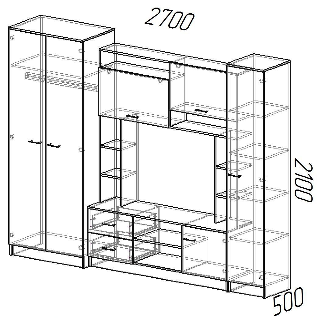 Универсальное решение, которое будет уместно смотреться в любом современном интерьере. Имеет большое количество открытых и закрытых полок, два выдвижных ящика снизу, пенал с антресольной полкой и штанкой для вешалок.