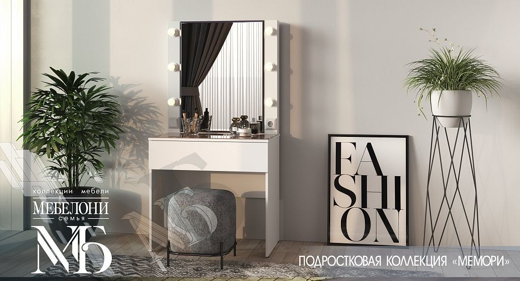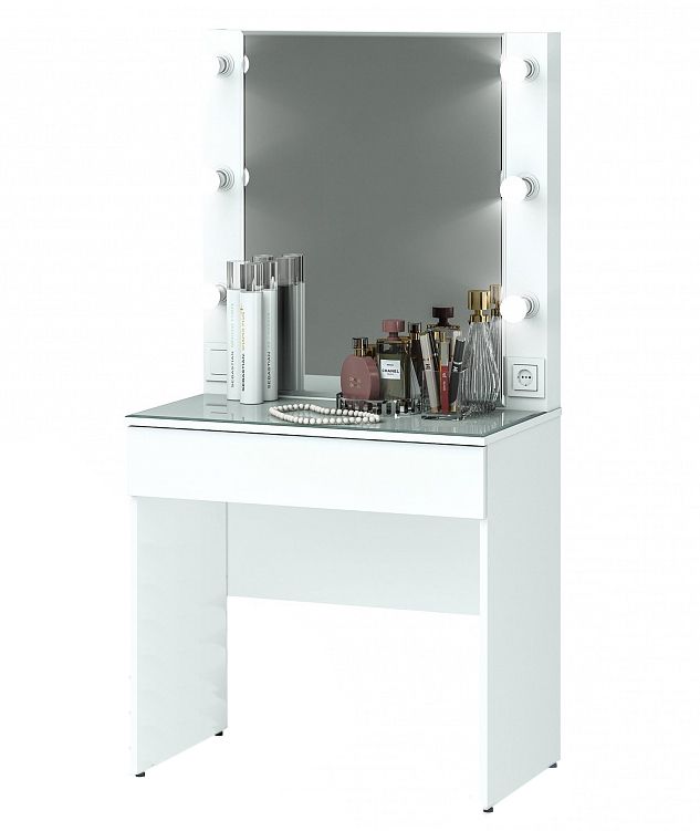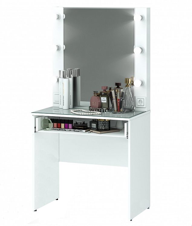 Туалетный столик оснащен подсветкой по периметру, розеткой и выключателем, лампочки не идут в комплекте. Цоколь Е27 для лампочек. 6 шт.