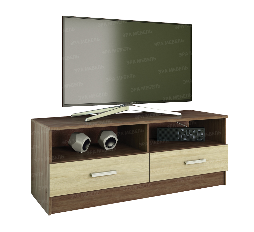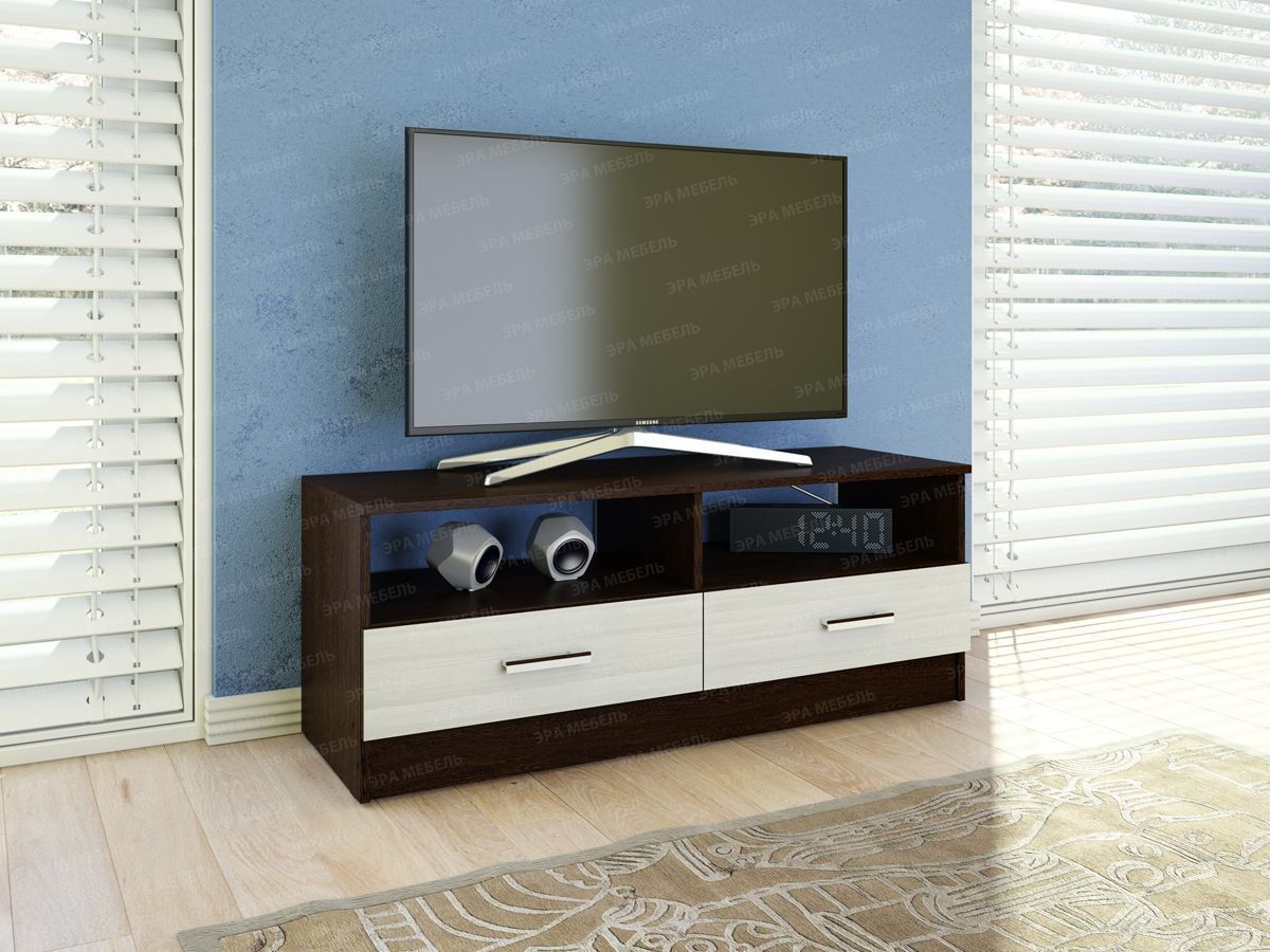 Тумба под ТВ отличается лаконичным дизайном и продуманностью конструкции. Укомплектована двумя выдвижными ящиками и двумя нишами.