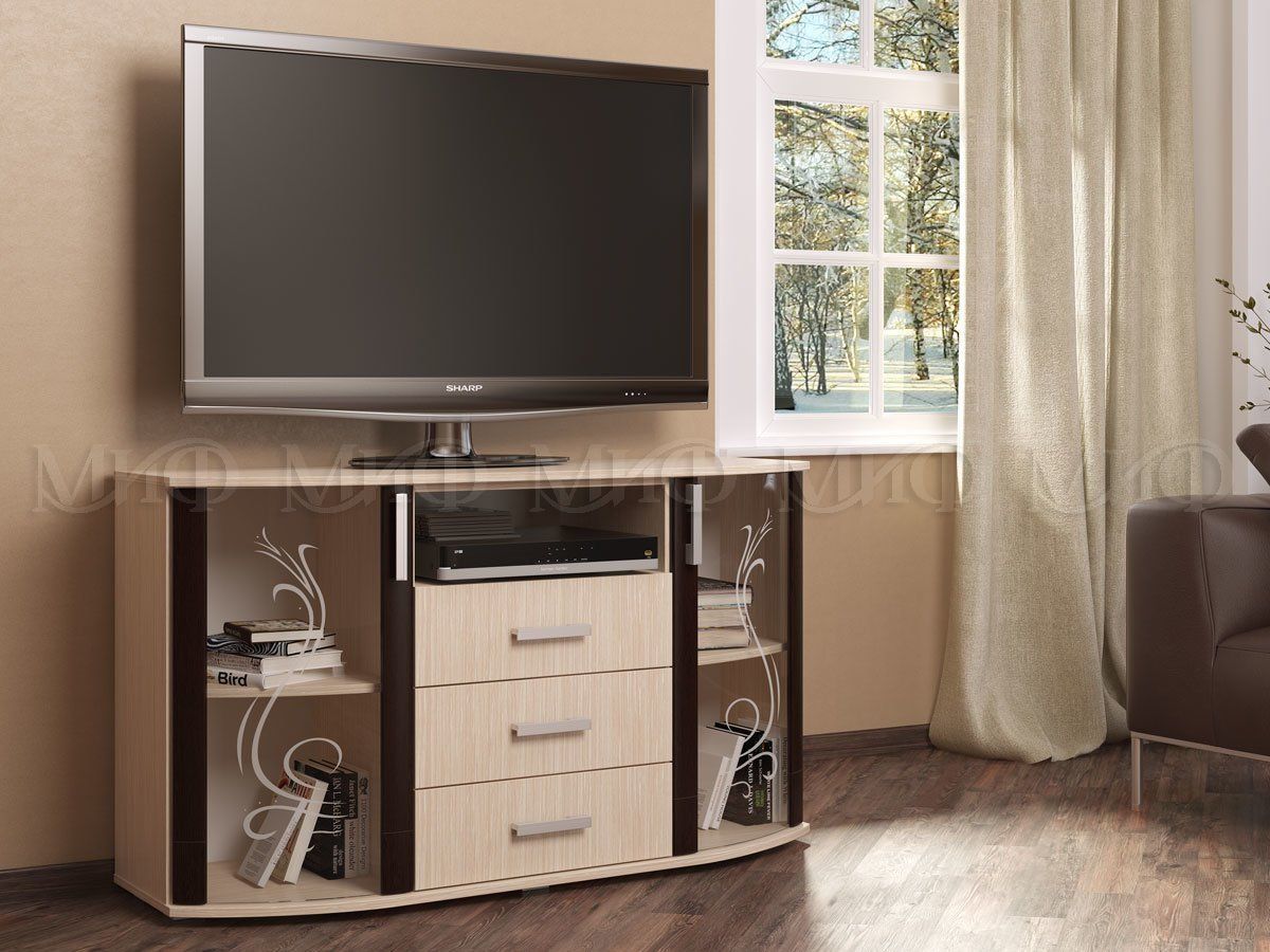 Напольная подставка под телевизор и прочую технику. Продуманная конструкция включает в себя боковые шкафчики и три выдвижных ящика. Объем тумбы увеличен за счет выпуклой передней части.